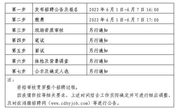 2022年6月1日至2022年6月7日16:00 在鴻雅招聘網(wǎng)(http://www.cdhyjob.com/)、鴻雅微信公眾號、國控集團(tuán)官方網(wǎng)站(http://m.wfdsc.cn/)及上級部門要求的相關(guān)網(wǎng)站等發(fā)布招聘公告。