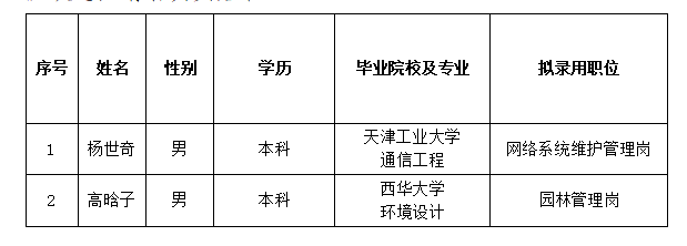 根據(jù)2023年度承德市國(guó)瑞置業(yè)有限責(zé)任公司公開(kāi)招聘工作人員的相關(guān)要求,經(jīng)過(guò)筆試、面試、體檢和考察等程序,確定楊世奇、高晗子2名同志為承德市國(guó)瑞置業(yè)有限責(zé)任公司擬錄用工作人員,現(xiàn)予以公示。現(xiàn)對(duì)擬錄用人員信息進(jìn)行公示,公示期間如有異議,可通過(guò)電話、信函等方式反映,反映意見(jiàn)請(qǐng)署真實(shí)姓名。
