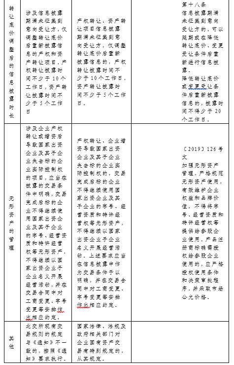 八、產(chǎn)權(quán)轉(zhuǎn)讓、資產(chǎn)轉(zhuǎn)讓項目信息披露期滿未征集到意向受讓方,僅調(diào)整轉(zhuǎn)讓底價后重新披露信息的,產(chǎn)權(quán)轉(zhuǎn)讓披露時間不少于10個工作日,資產(chǎn)轉(zhuǎn)讓披露時間不少于5個工作日。(與32號文相應(yīng)規(guī)定相比,縮短了信息披露的時間,提升了效率)